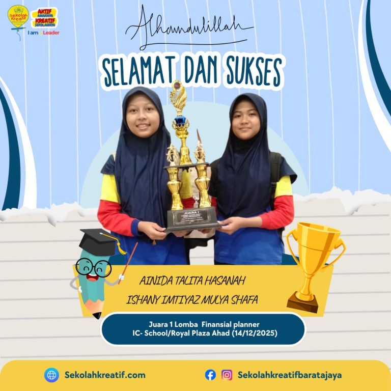 Sekolahkreatif.com – Alhamdulillah, prestasi membanggakan kembali ditorehkan oleh siswa kelas VI. Dua siswa berbakat, Ishany Imtiyaz Mulyashfa dan Ainida Talita Hasanah, berhasil meraih Juara I dalam Lomba Cuan Fest pada misi keuangan bertema Financial Planner.